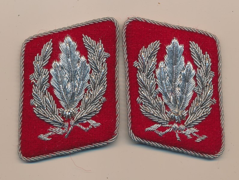 WWII German Nationalsozialistisches Kraftfahrkorps NSKK Korpsfuhrer Adolf Huhnlein / Erwin Kraus collar tabs set. Beautifully hand embroidered with silver bullion thread and cording on red wool. Will be a very nice addition to any NSKK collection.
